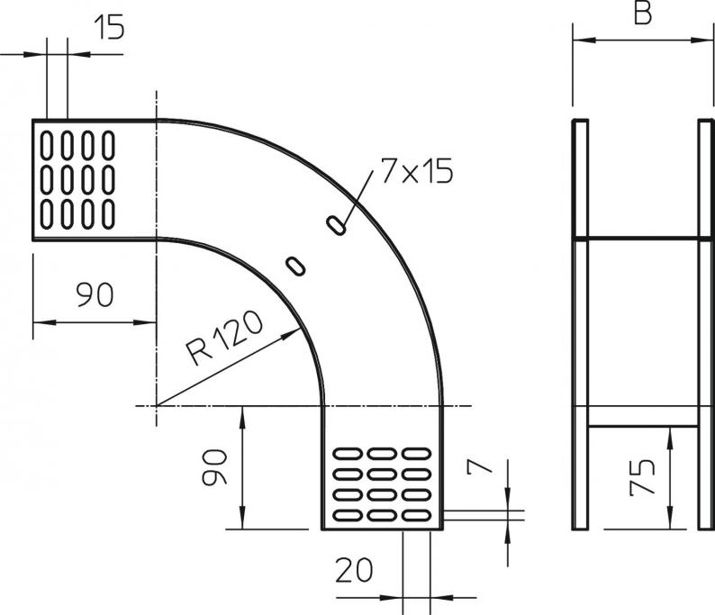 90° vertical bend, falling, for all cable tray types of 85 mm side height.