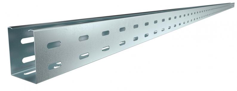 Cable tray with continuous bottom and side perforation as well as central holes (Ø11 mm) in the base for additional fastenings.
