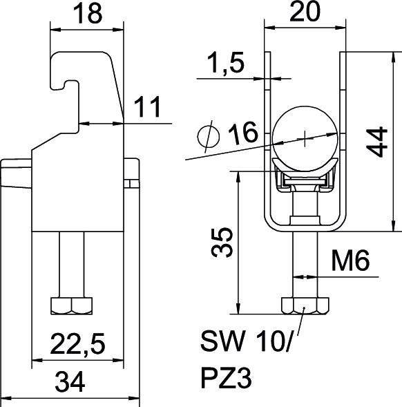 Clamp clip with U-foot, plastic pressure sleeve made of polypropylene. For vertical and horizontal mounting of 1 single cable on a C-profile rail. For slot width 18–22 mm. With 1-start screw thread on pressure sleeve, universal hexagonal screw head WAF10, with slot and cross recess. Suitable for assembly indoors and outdoors. We recommend the use of a counter-sleeve.