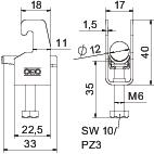 Clamp clip with U-foot, plastic pressure sleeve made of polypropylene. For vertical and horizontal mounting of 1 single cable on a C-profile rail. For slot width 18–22 mm. With 1-start screw thread on pressure sleeve, universal hexagonal screw head WAF10, with slot and cross recess. Suitable for assembly indoors and outdoors. We recommend the use of a counter-sleeve.