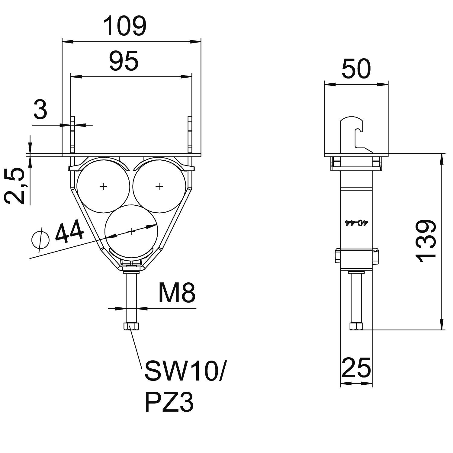 Clip element, bolt and lock plate made of hot-dip galvanised steel, pressure and counter-trough made of polypropylene, halogen-free, light grey RAL 7035.