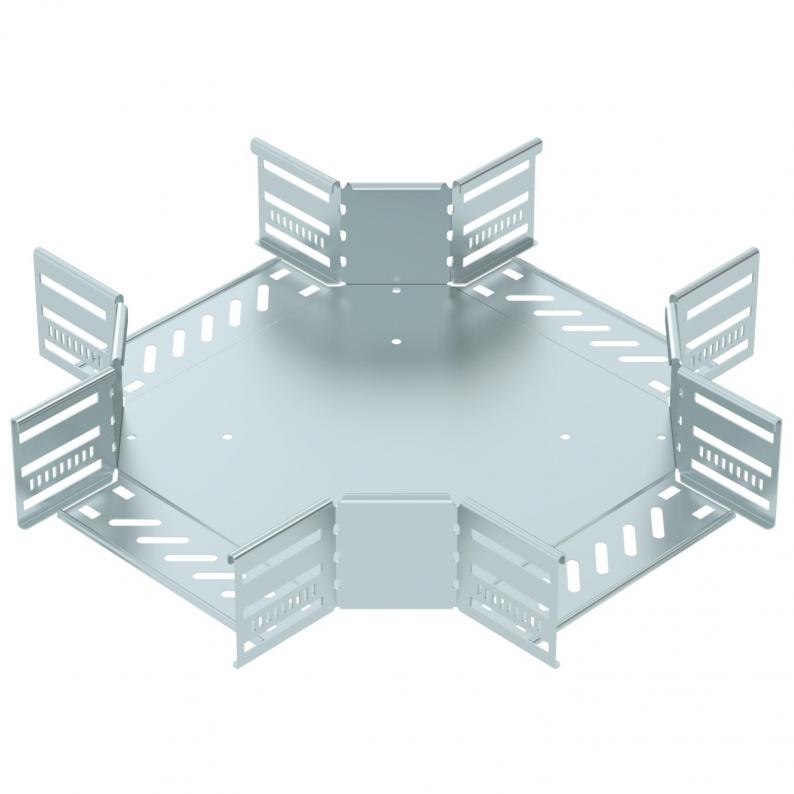 Cross-over for the creation of a horizontal branch, fitting for lock and screw-on cable trays of side height 85 mm. Screwless mounting with double clamps or screw connection with FRS truss-head screws and M6 combination nuts. Can be used in indoor areas. Fastening material must be ordered separately.
