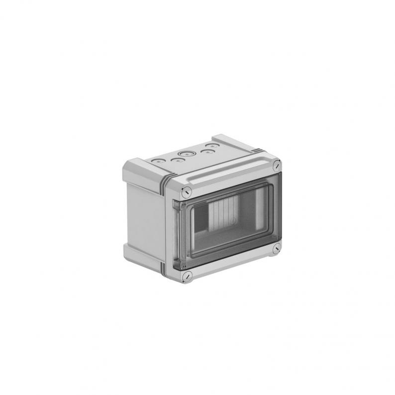Distribution box with terminal strip for surface mounting, for the current sub-distribution in interior and protected exterior areas, in accordance with IEC 439-3. With pre-mounted 35 mm hat profile rail. IP66 protection type and IK07 protection rating. Transparent cover to screw on, with cut-out.