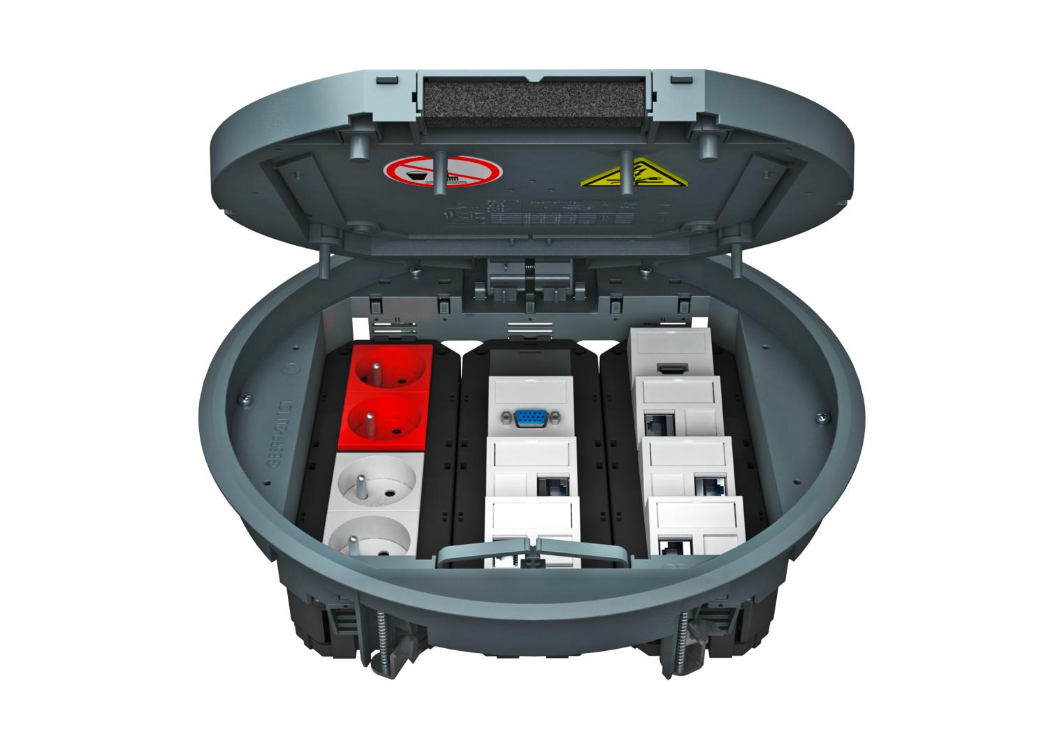 Service outlet with locking slider for up to 12 individual Modul 45 devices in 3 UT4 universal supports, use in duct and trunking systems and system floors.