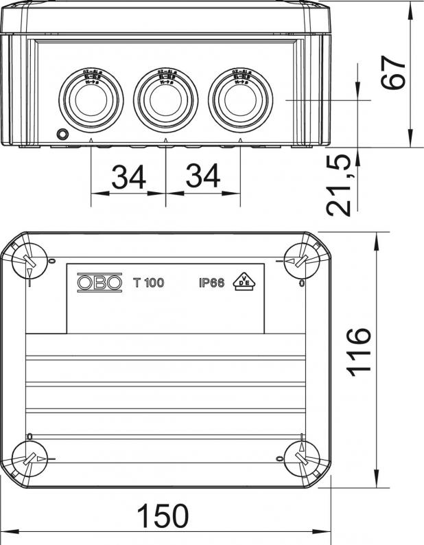 Junction box for the connection of cables and lines indoors and in protected outdoor areas. Rectangular design with plug-in seals to the sides and knock-out entries in the bottom. Suitable for wall and ceiling mounting and on mounting panels. With the option to fasten inside and to mount via the corner domes. Cover with quick lock, sealable. Made from halogen-free and UV-resistant materials.