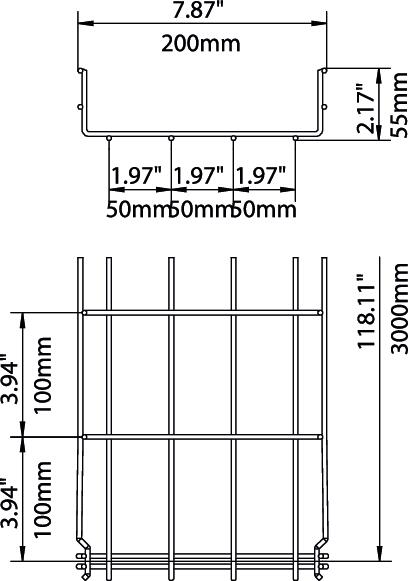 No additional connection components are required for the mesh cable tray, it is simply interlocked. The grid width is 50 x 100 mm (exception: GRM 55/50 = 20 x 100 mm).