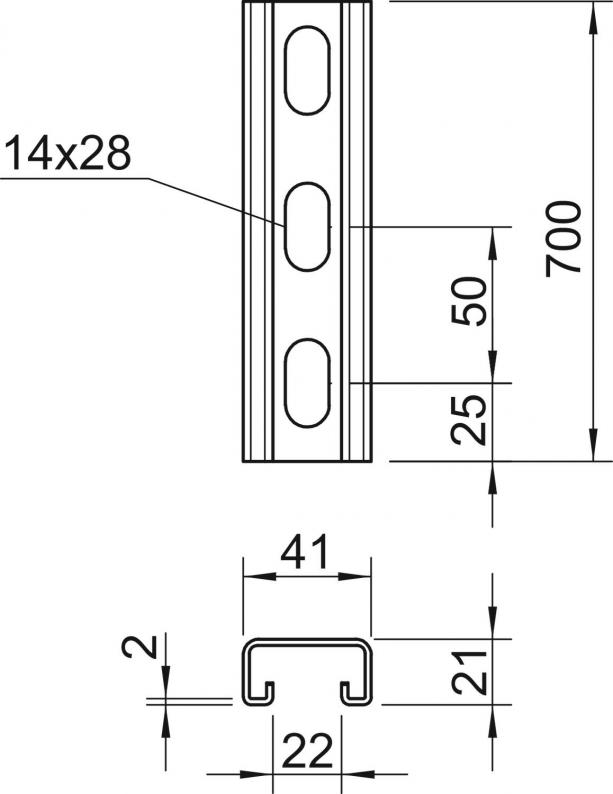 Heavy-duty C profile rail for individual installation of support constructions, e.g. for cable trays or as a panel for switchgear cabinets. Can also be used for cable routing, in conjunction with clamp clips with a U foot.