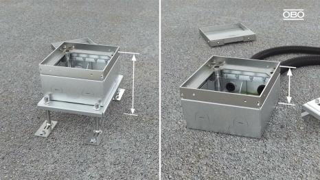 Square floor socket for use in dry-care systems and screed floors in indoor areas. Installation housing with pre-marked insertion openings for pipes (M20/M25). Cover adjustable to top edge of floor covering using four height-adjustment supports. The minimum installation depth is 75 mm, the height-adjustment range +30 mm. Frame and cover made of brass and visible in the floor covering. Cover with decorative plate hammer blow. Empty housing for a 45® installation device and a data socket. When delivered, the item is closed with a blanking plate.