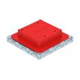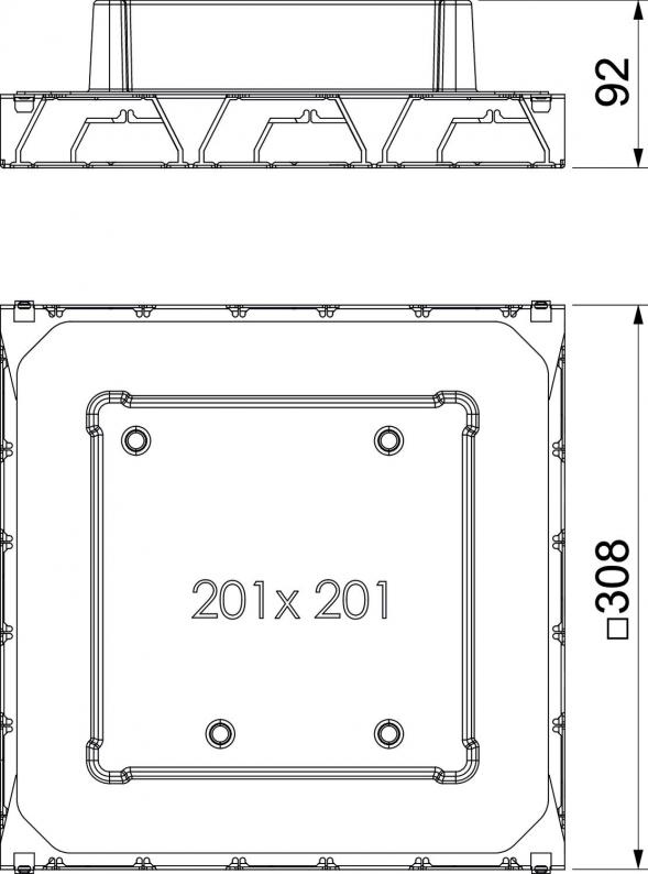 Underfloor outlet box with fixed, unchangeable 201 x 201 mm installation opening for an installation unit of nominal size 4. The mounting opening is created using the screed protection cover contained in the scope of supply. The underfloor box possesses installation openings for three single-compartment PVC ducts of nominal size 60 x 25 and 90 x 35 on all four sides. The box is principally suited for use in floor structures in cement screed with a structure height of up to 90 mm.