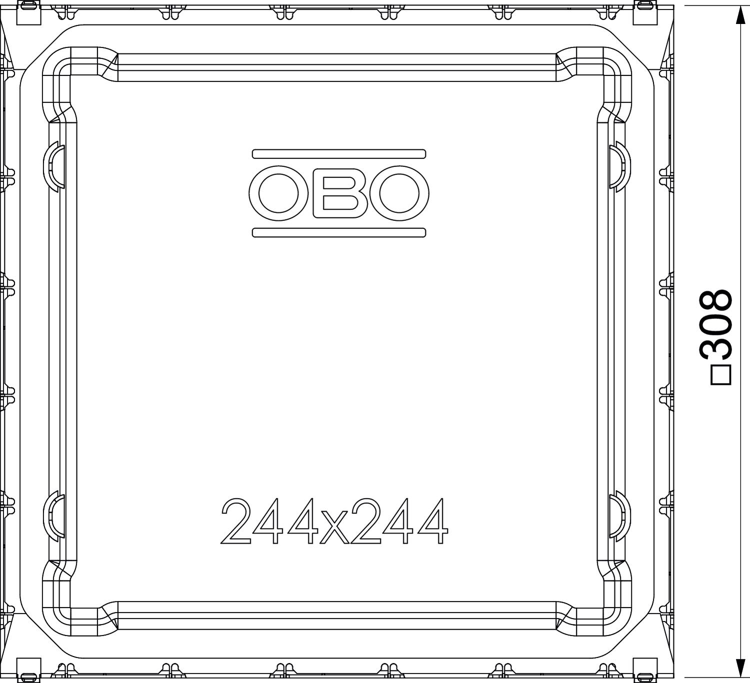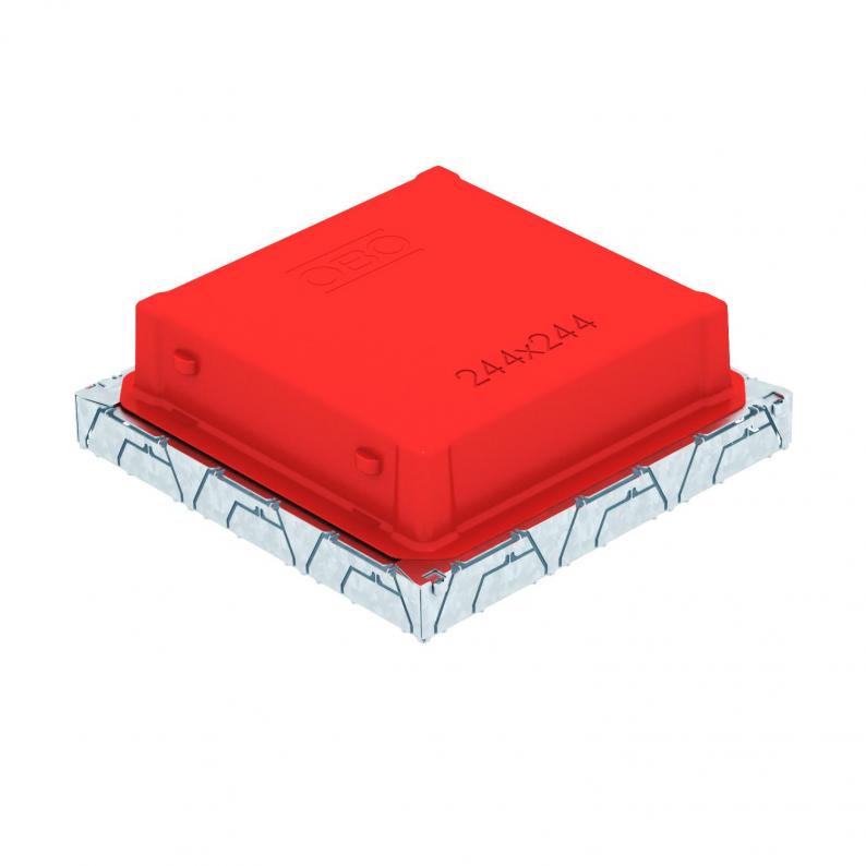 Underfloor outlet box with fixed, unchangeable 244 x 244 mm installation opening for an installation unit of nominal size 9. The mounting opening is created using the screed protection cover contained in the scope of supply. The underfloor box possesses installation openings for three single-compartment PVC ducts of nominal size 60 x 25 and 90 x 35 on all four sides. The box is principally suited for use in floor structures in cement screed with a structure height of up to 100 mm.
