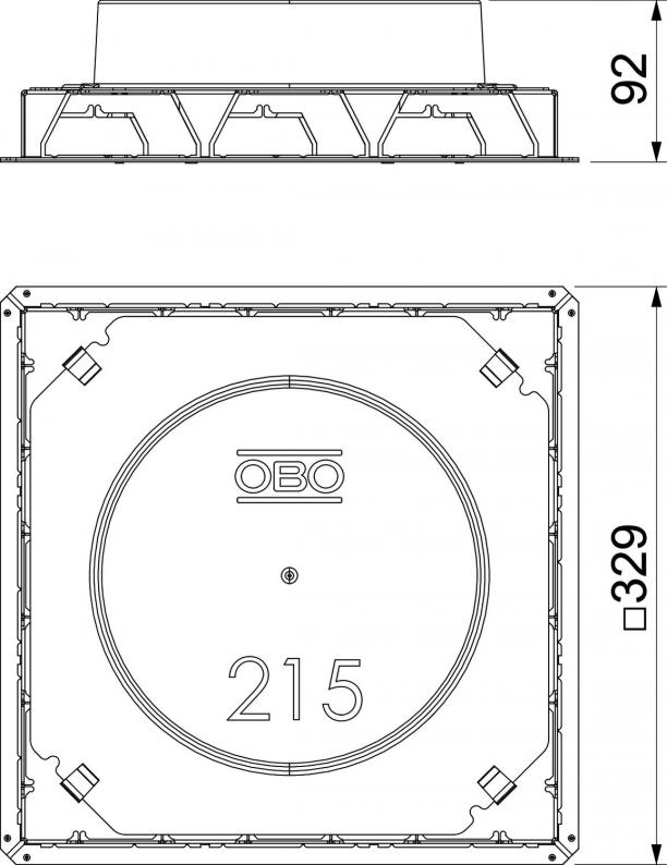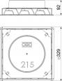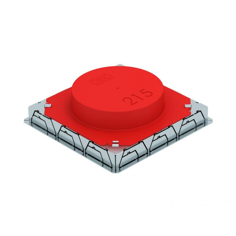 Underfloor outlet box with fixed, unchangeable installation opening of Ø 215 mm for an installation unit of nominal size R4. The mounting opening is created using the screed protection cover contained in the scope of supply. The underfloor box possesses installation openings for three single-compartment PVC ducts of nominal size 60 x 25 and 90 x 35 on all four sides. The box is principally suited for use in floor structures in cement screed with a structure height of up to 90 mm.