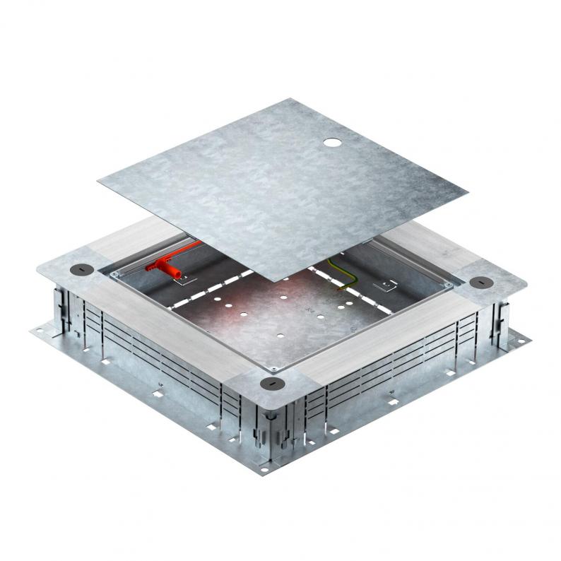 Junction and branch box for screed-covered underfloor installation duct with sheet steel side walls. For mounting of installation units in the mounting cover (to be ordered separately). Can be infinitely adjusted to a nominal screed height of 80–160 mm using the quick height-adjustment unit. The screed can be worked up to be flush with the screed draw-off edge. With noise decoupling option after screed laying and can also be used with system accessories for heavy-duty applications. Insertion of cables with the 2-part EÜK duct.