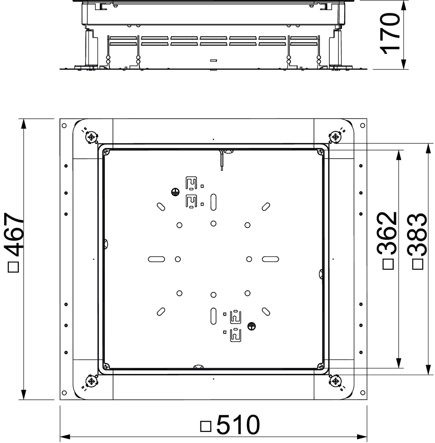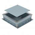 Underfloor junction and branch box for screed-covered underfloor installation ducts with sheet steel side walls. To mount installation units in the mounting lid (to be ordered separately). Height can be infinitely adjusted to the nominal screed height (rapid adjustment possible) and the screed can be worked flush to the screed scraping edge. With noise decoupling option after screed laying and can be used with system accessories, also for heavy-duty application.