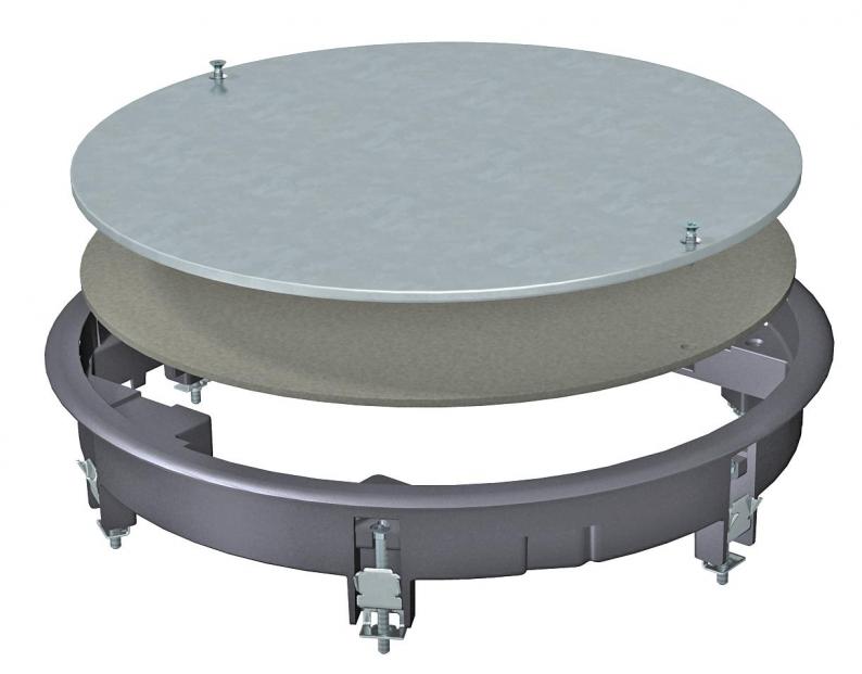 Draw box insert for blank closing of a round mounting opening of nominal size R7 in trunking systems and in raised and cavity floors. With universal fastening bracket.
